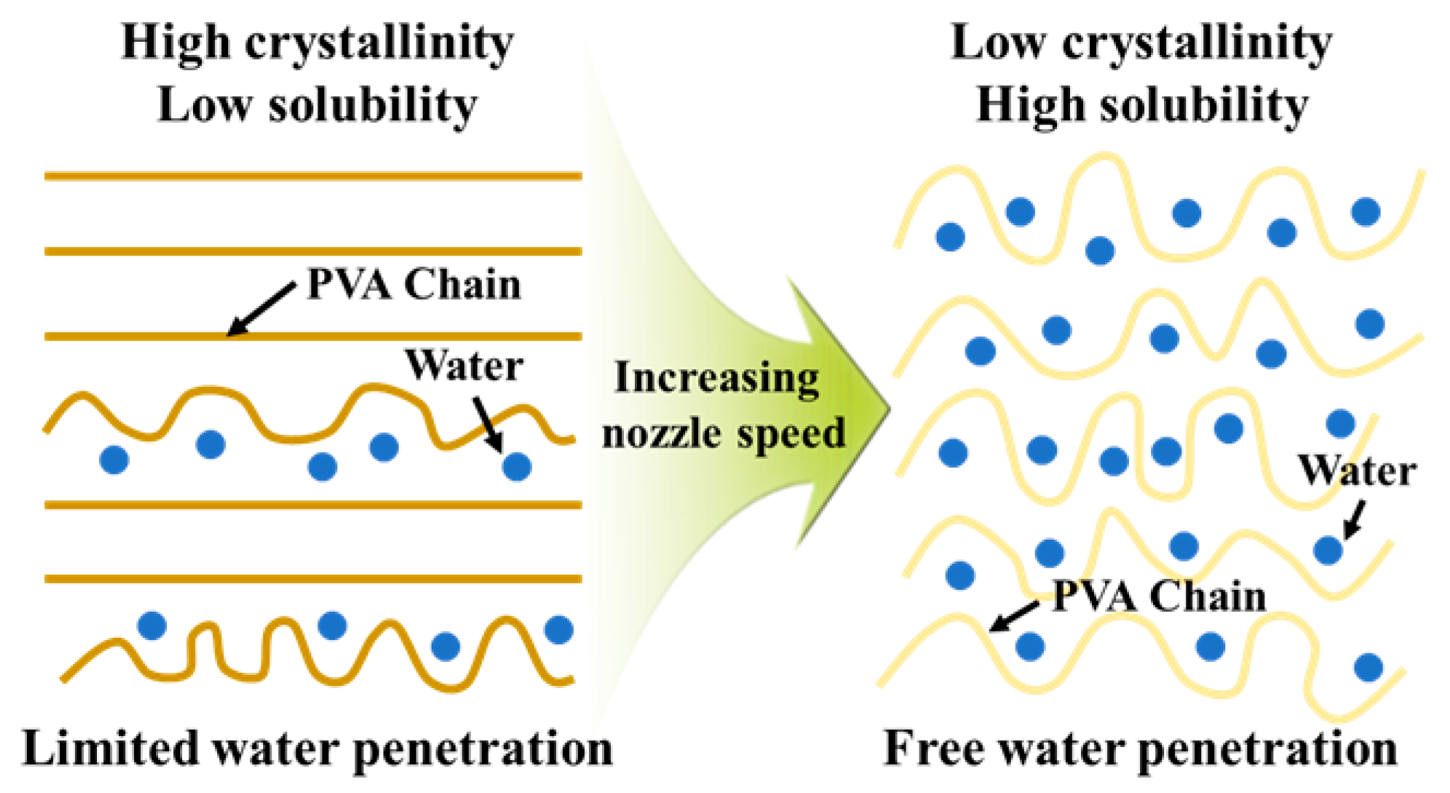 p = 0.052, suggesting that the increase in dissolution rate with nozzle speed is marginally significant at the 95% confidence level and becomes statistically significant when considering a 90% confidence level. These results clearly demonstrate that the specimens with higher crystallinity exhibited slower dissolution, whereas those with lower crystallinity dissolved more readily. Taken together, these findings indicate that nozzle speed acts as a critical process parameter governing both the crystallinity and dissolution behavior of PVA supports. The mechanism is schematically illustrated in
