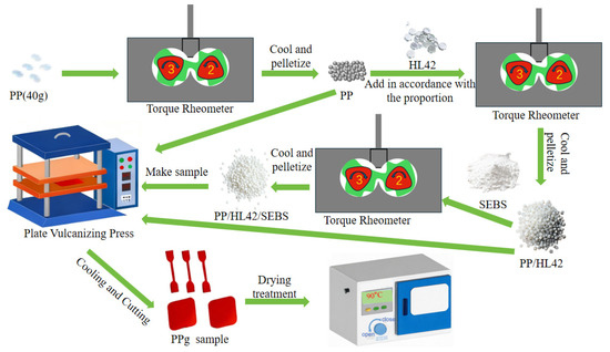 The specific process is as follows: the temperature of each zone of the torque rheometer was set at 180 °C. After the temperature was reached, the speed was set to 60 rpm/min, and the accurately weighed PP pellets were added. After mixing for about 6 min, the molten PP compound was obtained. When the torque curve became stable, the speed was adjusted to 30 rpm/min, and the accurately weighed hollow glass microspheres (HL42) were added. After mixing for 3 min and the torque curve became stable again, and the PP/HL42 pellets were obtained. On this basis, SEBS was added to obtain the PP/HL42/SEBS pellets. Step two: The three types of pellets were melted in a flat vulcanizing machine at 180 °C for 15 min. Then, the pressure increased, and the pellets were pressed for 5 min each at 5 MPa, 10 MPa, and 15 MPa. After that, the pellets were cooled in a mold with water for 5 min to form the lightweight polymer samples for characterization and testing. The process is shown in Figure 2.