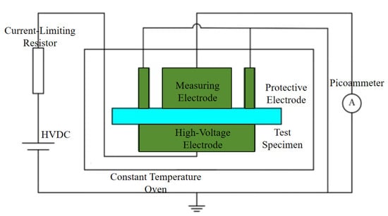 Volume Resistivity Testing: In this study, a three-electrode high-resistance tester (model ZC-36 Shanghai Sixth Electric Meter Factory Co., Ltd., Shanghai, China) was used to characterize the direct current volume resistivity of the samples under ambient temperature conditions. As shown in Figure 3, the testing system mainly consists of a high-voltage DC power supply, a three-electrode device, an electrostatic detection unit, a current-limiting resistor, and a constant-temperature chamber. To ensure effective contact between the sample and the electrodes, an aluminum conductive layer was evenly applied to both sides of the sample before testing. During the test, a constant-temperature environment of 25 °C was maintained in the chamber, and a continuous DC electric field of 10 kV/mm was applied to the sample with a thickness of approximately 100 μm for 30 min. The steady-state resistance value was recorded, and the volume resistivity was calculated according to Equation (1). At least five parallel samples were tested for each material, and the arithmetic mean was taken as the final result after verifying the repeatability of the data.
