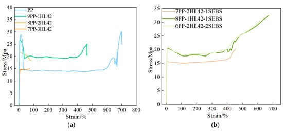 Tensile test result diagram of composite materials. (a) Stress–strain curves of PP and PP-HL42; (b) Stress–strain curves after adding SEBS.