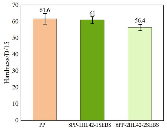 The Shore hardness test results (Figure 7) indicate that as the contents of HGM and SEBS increase simultaneously, the hardness decreases gradually, while the data dispersion continuously reduces. The reduced dispersion suggests improved system homogeneity and fewer internal defects, which is conducive to enhancing the material consistency. The reduction in hardness implies that the matrix is more likely to undergo shear yielding rather than brittle cracking: under external force, plastic deformation occurs before the nucleation of crazing, thereby increasing the fracture toughness. Meanwhile, the low hardness allows stress concentration areas to be dispersed, significantly reducing the size and density of microcracks [38,39]. Therefore, the PP system toughened by the synergistic effect of HGM and SEBS has achieved better damage tolerance while maintaining lightweighting.