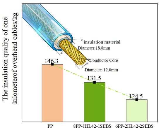 From the density test data provided (Table 2), it can be seen that the density of the melt-blended PP-HL42-SEBS composite decreases with the increasing content of HGM. The density of 6PP-2HL42-2SEBS is 15% lower than that of pure PP, indicating a reduction of 133 kg in mass per cubic meter. For overhead cables (Figure 8), the insulation weight of a 1 km-long PP insulated overhead cable (insulation thickness: 3.4 mm; PP density: 0.890 g/cm3; conductor nominal cross-sectional area: 120 mm2; conductor diameter: 12.0 mm) is approximately 146.3 kg. When the insulation material of the overhead cable with the same dimensions is replaced with 6PP-2HL42-2SEBS, the insulation weight is about 124.5 kg, a reduction of approximately 21.8 kg. This can significantly reduce the load on supports such as utility poles and transmission towers, thereby extending the service life of the overhead cables.