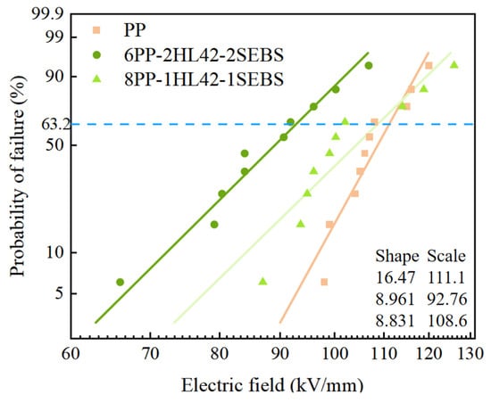 Figure 10 presents the Weibull probability plots of the breakdown strength data for three materials (PP, 6PP-2HL42-2SEBS, and 8PP-1HL42-1SEBS) analyzed based on the Weibull distribution. Herein, the scale parameter of the Weibull distribution characterizes the characteristic breakdown strength of the material, which refers to the electric field strength corresponding to the breakdown of approximately 63.2% of the samples. As can be observed from the data in the figure, pure PP exhibits the highest characteristic breakdown strength, while the composites incorporated with HGM and SEBS demonstrate differentiated breakdown behaviors: the 6PP-2HL42-2SEBS composite shows the lowest characteristic breakdown strength of 92.76 kV/mm, and the 8PP-1HL42-1SEBS composite has a characteristic breakdown strength of 108.6 kV/mm, which falls between that of pure PP and 6PP-2HL42-2SEBS. The primary reasons for this phenomenon are as follows: a weak interface exists between PP and HGM, which is prone to forming microvoids, thereby inducing electric field distortion and local field strength concentration; simultaneously, the introduction of HGM and SEBS may bring in impurity ions and generate charge traps, ultimately leading to a slight decrease in the breakdown strength of the composites compared to pure PP [42].