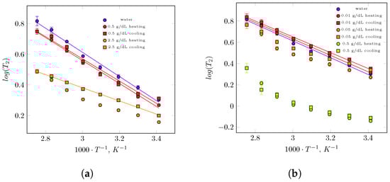 Spin–spin relaxation time vs. reciprocal temperature for guar gum solution of concentration 0.05 g/dL—semidiluted regime and 2.5 g/dL—concentrated regime (a) and xanthan gum solutions in three regimes: diluted—0.01 g/dL, semidilute—0.05 g/dL and concentrated—0.5 g/dL (b). Additionally, on both figures, the temperature dependence of for water has been shown. Solid lines are Arrhenius fits of data in the whole temperature range.