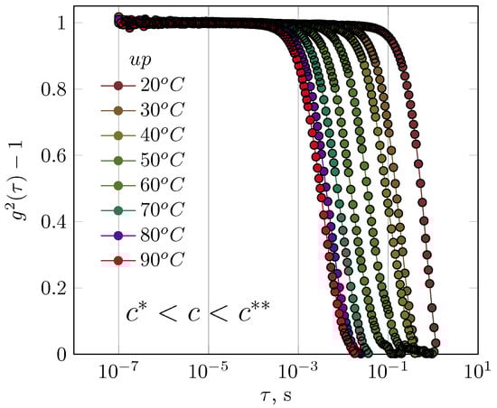 First, the results for GG solutions in the semidilute range are presented. It was not possible to obtain interpretable results of DLS measurements for concentrated GG solutions. An increase in temperature caused changes to the autocorrelation function (Figure 2). At the lowest temperature, this function disappeared after 1 s; at 90 °C, however, the relaxation of the GG chains occurred within a shorter time interval of 0.01 s. Changes in the behaviour of GG chains in the semidilute regime occurred evenly as a function of temperature without altering the shape of the autocorrelation function (Figure 2).