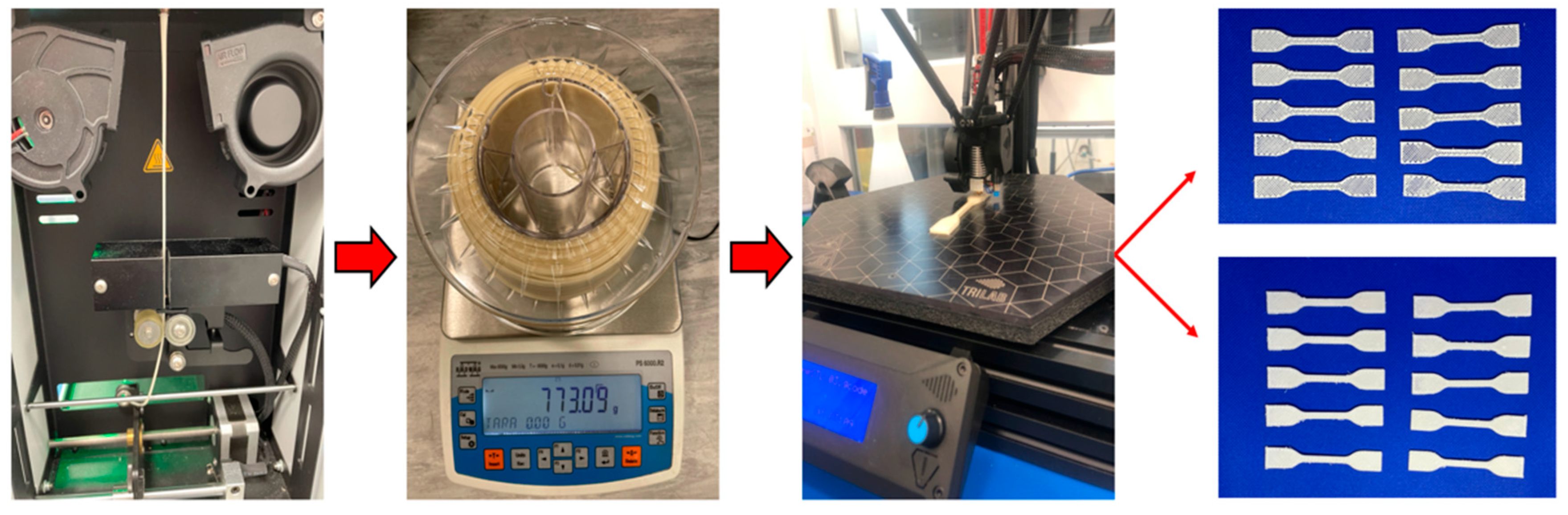 19]. Using a desktop extrusion system, we produced three filaments with the type labels 111, 145, and 146 from the above-mentioned biodegradable components. Extrusion is a manufacturing process in which thermoplastic materials are forced through a die with a defined cross-sectional profile to produce a continuous strand of molded product (filament). The extrusion process begins with the material in the form of granules, pellets, or powders being fed from a hopper into the extruder zone. Then the melting process begins by means of the heat from mechanical energy generated by the rotation of the screw and the heaters that are placed along the head. The molten materials are then forced into the die, which structures the materials during the cooling process. Large companies use industrial filament makers (extrusion systems), which are characterized by large volumes of extruded material and precision. In our research, however, we chose desktop extrusion systems at a good level because desktop extrusion systems are increasingly on par with industrial extrusion systems in quality. When filament is used in additive technologies, it is essential that it meets the requirements needed for high-quality 3D printing of implants suitable for tissue substitution. Essential filament characteristics for additive manufacturing include high mechanical strength, uniform diameter consistency, and a smooth surface finish. These properties are critical determinants of the dimensional accuracy, structural integrity, and overall quality of the final printed constructs. Notably, the Fused Deposition Modeling (FDM/FFF) technique, which underpins much of modern polymer-based 3D printing, was first patented in 1989, providing the foundation for subsequent advancements in additive manufacturing technologies [