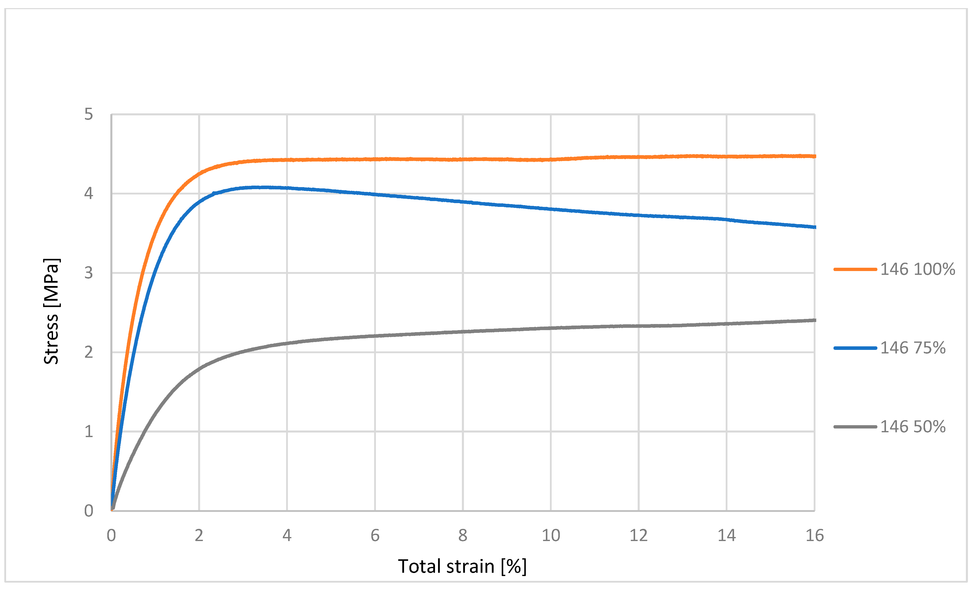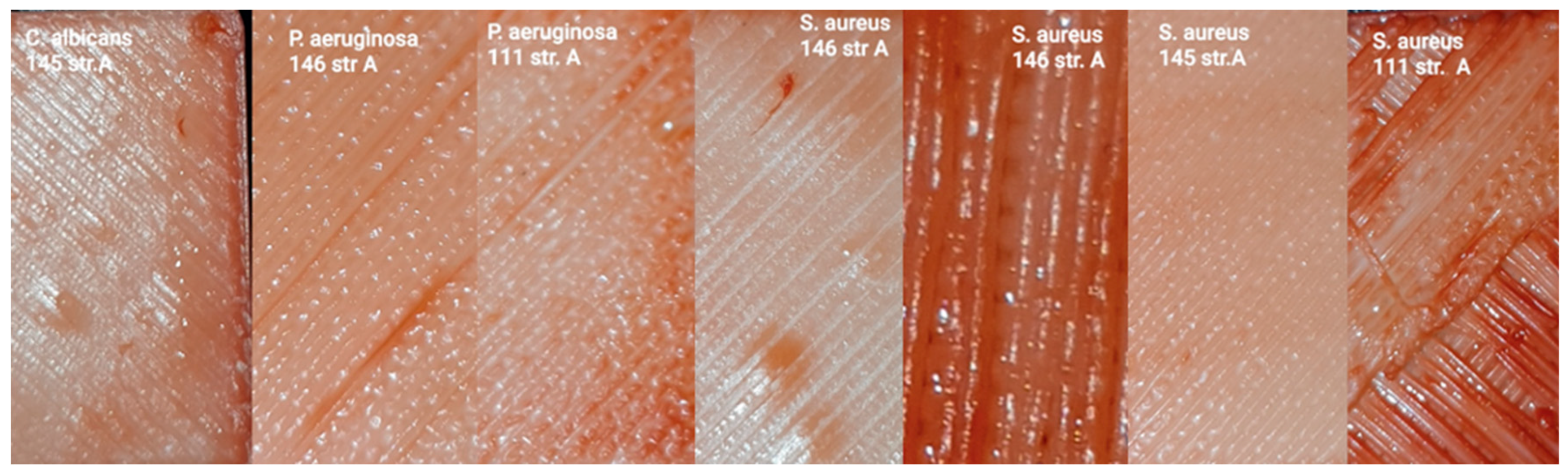 32]. Mechanical characterization using an MTS Insight testing system, combined with microbiological assessments against various bacterial and fungal strains, produced statistically significant data that are synthesized in the subsequent sections. These dual modalities of testing provide a comprehensive evaluation of both the structural robustness of the samples and their resistance to microbial colonization under relevant biological conditions [