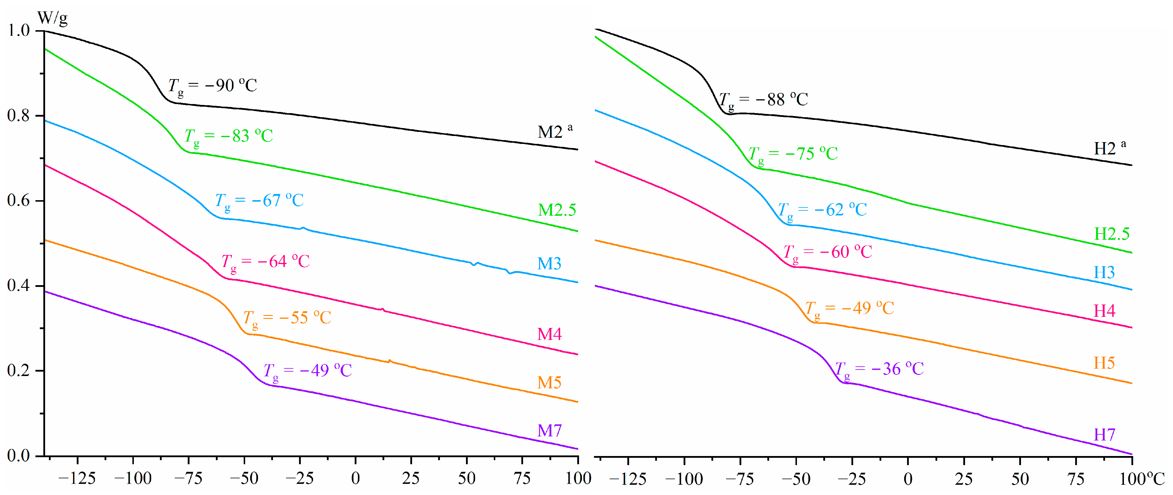 The plots of Tg vs. molecular weight (Mn) of the metathesis (M2M7) and hydrogenated (H2H7) oils (Figure 2) are straight lines with the coefficient of determination R2 = 0.94–0.96. These coefficients are lower than those we have obtained recently for poly(5-n-butyl-2-norbornene) oils after their fractionation [30]. The reason is that the studied oils are characterized by a wider range of dispersity values (Ð = 1.6–2.0) compared to the dispersity of the products isolated by preparative chromatography [30]. Extrapolation of Tg values to 1/Mn = 0 enables estimation of the limiting glass transition temperatures for high-molecular-weight analogues of the same chemical structures: Tg = −31 °C for the high-molecular poly(5-n-butyl-2-norbornene) and Tg = −23 °C for its hydrogenated counterpart, which is very close to the values determined previously [30].