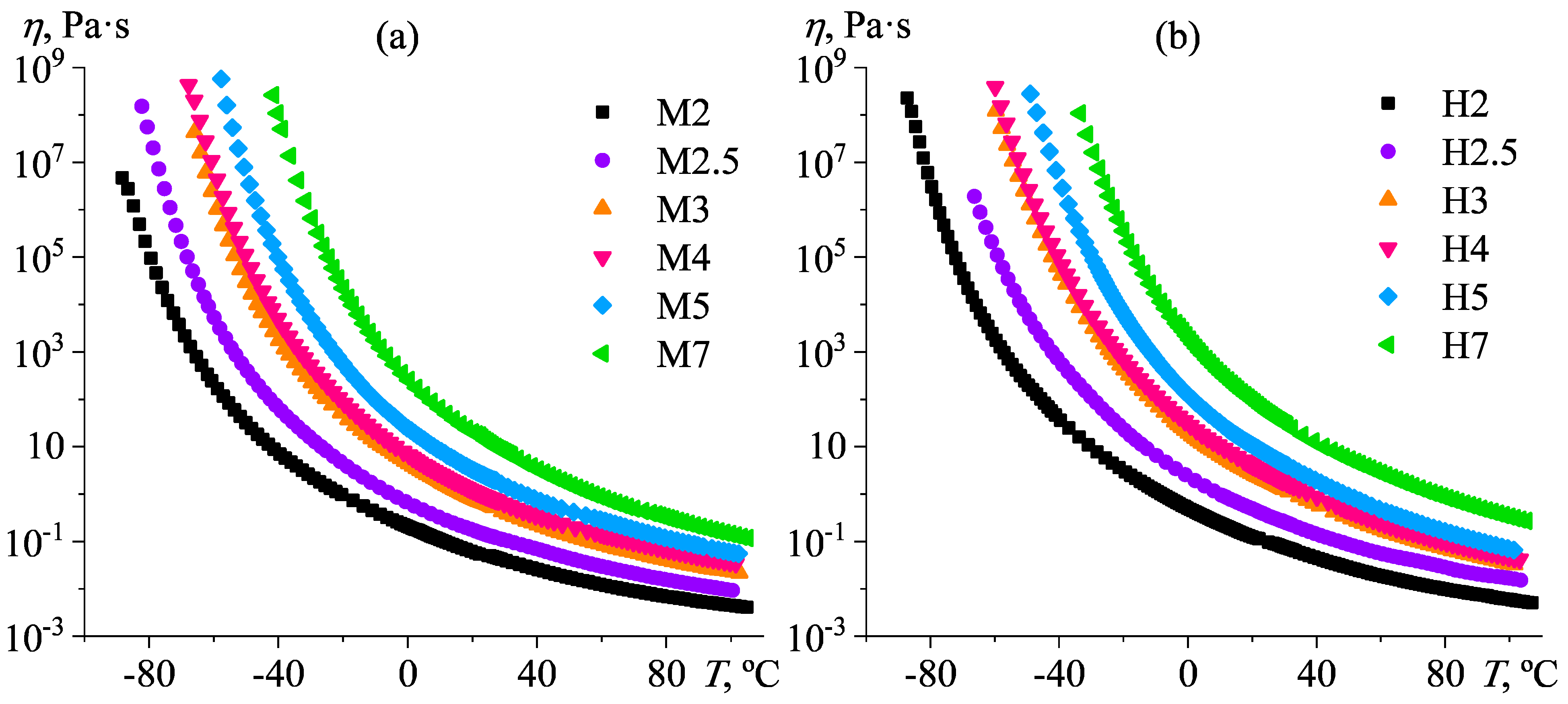 Viscosity properties were studied using a stress-controlled rotational rheometer (Discovery HR-30, TA Instruments, New Castle, DE, USA) equipped with a cone–plate unit featuring a 40 mm cone diameter and a 2° cone/plate angle. The temperature dependences of viscosity were determined at a temperature decrease rate of 3 °C/min using a constant shear stress of 1, 3, 10, or 100 Pa, depending on the viscosity of the sample under study, while merging the resulting curves. The relative error in measuring the rheological values did not exceed 5%.