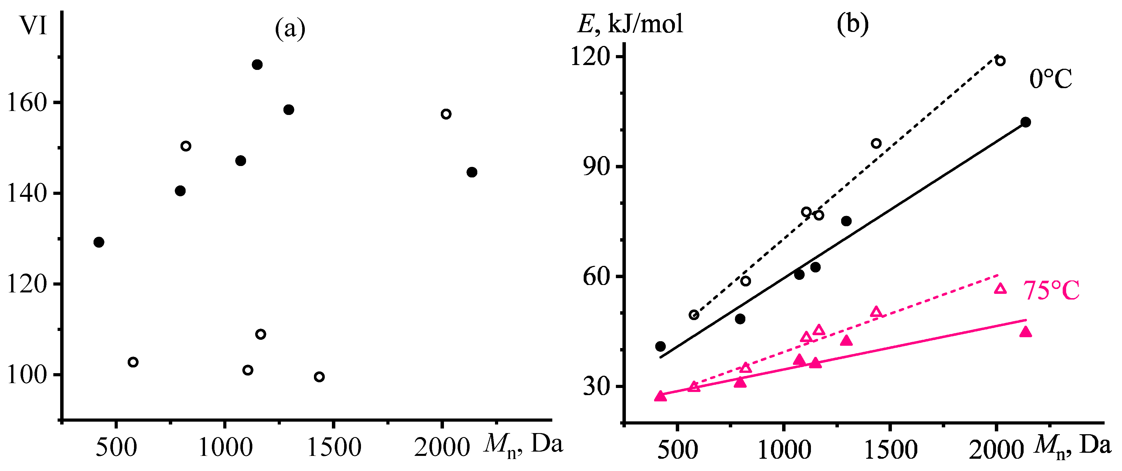 The sensitivity of oil viscosity to temperature variations is often described using the VI values that range from 0 to 100 for standard naphthenic and paraffinic oils, respectively, whose viscosities exhibit stronger or weaker temperature dependence [42]. In our case, the VI of poly(5-n-butyl-2-norbornene) oils does not correlate with their molecular weight (Figure 5a). An alternative and more scientifically substantiated measure of the temperature dependence of viscosity is the flow activation energy, as defined by the Frenkel–Andrade equation [43] as follows: