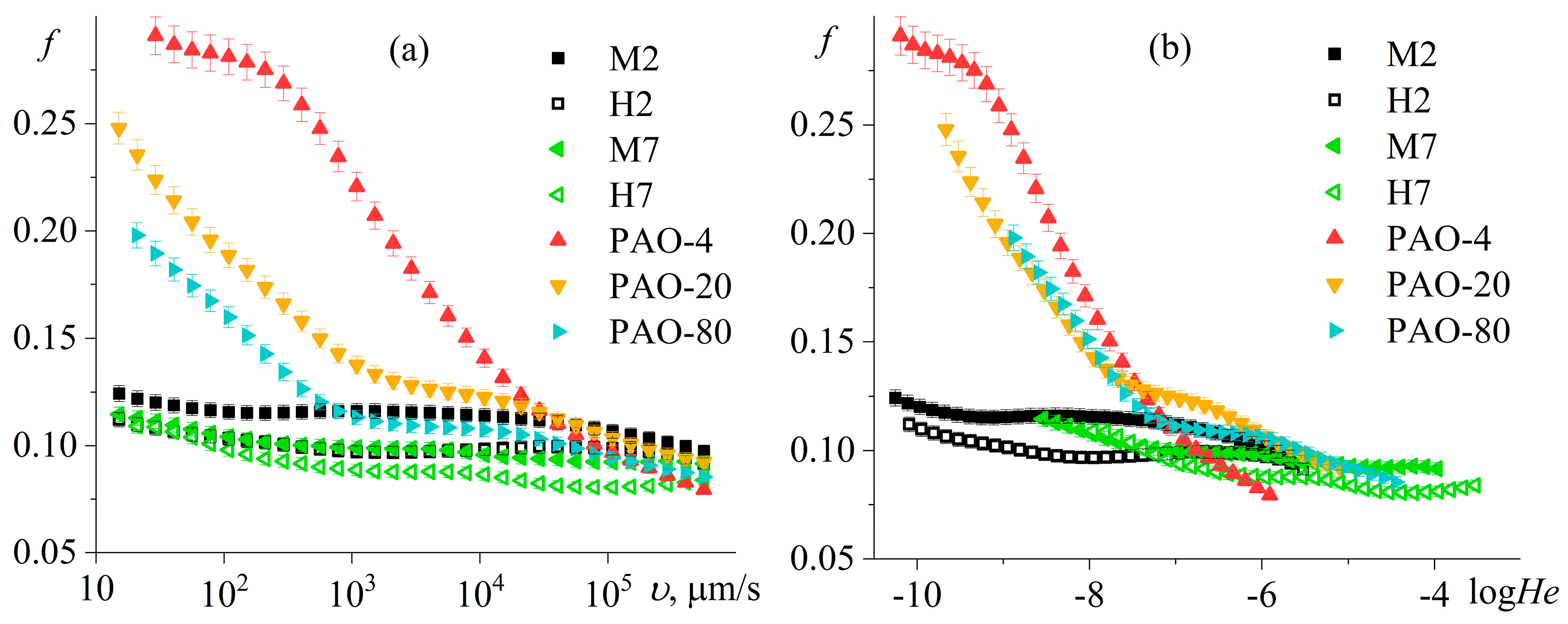 In addition to specific viscosity characteristics, effective lubricating oils must minimize friction and wear between contacting surfaces. Four-ball friction tests on poly(5-n-butyl-2-norbornene) oils reveal that hydrogenated oils provide more stable friction performance, because the friction coefficient exhibits smaller fluctuations with time when these oils are used (Figure 6b vs. Figure 6a). In the case of non-hydrogenated oils, the observed friction variations may arise from their reactivity at residual double bonds—likely more pronounced in the lowest-molecular-weight oil (M2), which also exhibits higher friction (Figure 6a). Hydrogenation consistently reduces the friction coefficient (f, Table 3) and the wear scar diameter (Dscar). The lowest friction and wear are observed for oils with intermediate molecular weights of approximately 1100–1400 Da. However, no significant correlations are found between the molecular weight or dispersity and either friction or wear (p > 0.1). The friction coefficient and the wear scar diameter demonstrate a weak linear correlation (ρP = 0.56 at p < 0.1), which is expected because reduced friction generally leads to less wear. Surprisingly, there are no significant correlations between friction, wear, and key oil indexes such as the molecular characteristics, viscosity, or flow activation energy. However, wear shows a strong linear correlation with the VI values (ρP = 0.77 at p < 0.01), which itself does not correlate with any other parameter, even with the flow activation energy (p > 0.1). The lack of correlation between viscosity and friction suggests a boundary or mixed lubrication regime, where steel surfaces intermittently come into direct contact, leading to wear. The lubrication regime is governed by the load applied and the sliding speed between surfaces, allowing the transition between lubrication regimes to be analyzed via Stribeck curves—plots of the friction coefficient as a function of sliding speed [33].