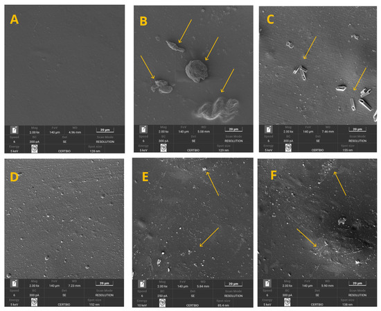 The analyses of the flat surface of the films through scanning electron microscopy (SEM) images are presented in Figure 8A–F. The images show the effect of powder addition at concentrations ranging from 0 to 5%, respectively. By examining Figure 8A–F, it can be observed that increasing the powder concentration in the polymer matrix enhanced the dispersion of the particles. When working with lower proportions, such as 1%, for example, the powder particles appear as agglomerates distributed with larger spacing between them on the surface (Figure 8B). In contrast, the gradual increase in this component promoted greater uniformity in particle distribution (Figure 8C–F).