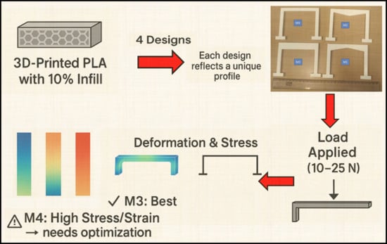 Overall, the combined numerical and experimental evaluation confirms that geometric design plays an important role in the mechanical performance of low-infill PLA components. Among the tested configurations, M3 showed the highest stiffness and lowest deformation among the tested designs for applications requiring enhanced stiffness and reduced deformation, whereas M4 would benefit from further optimisation to improve load distribution and bending stability.