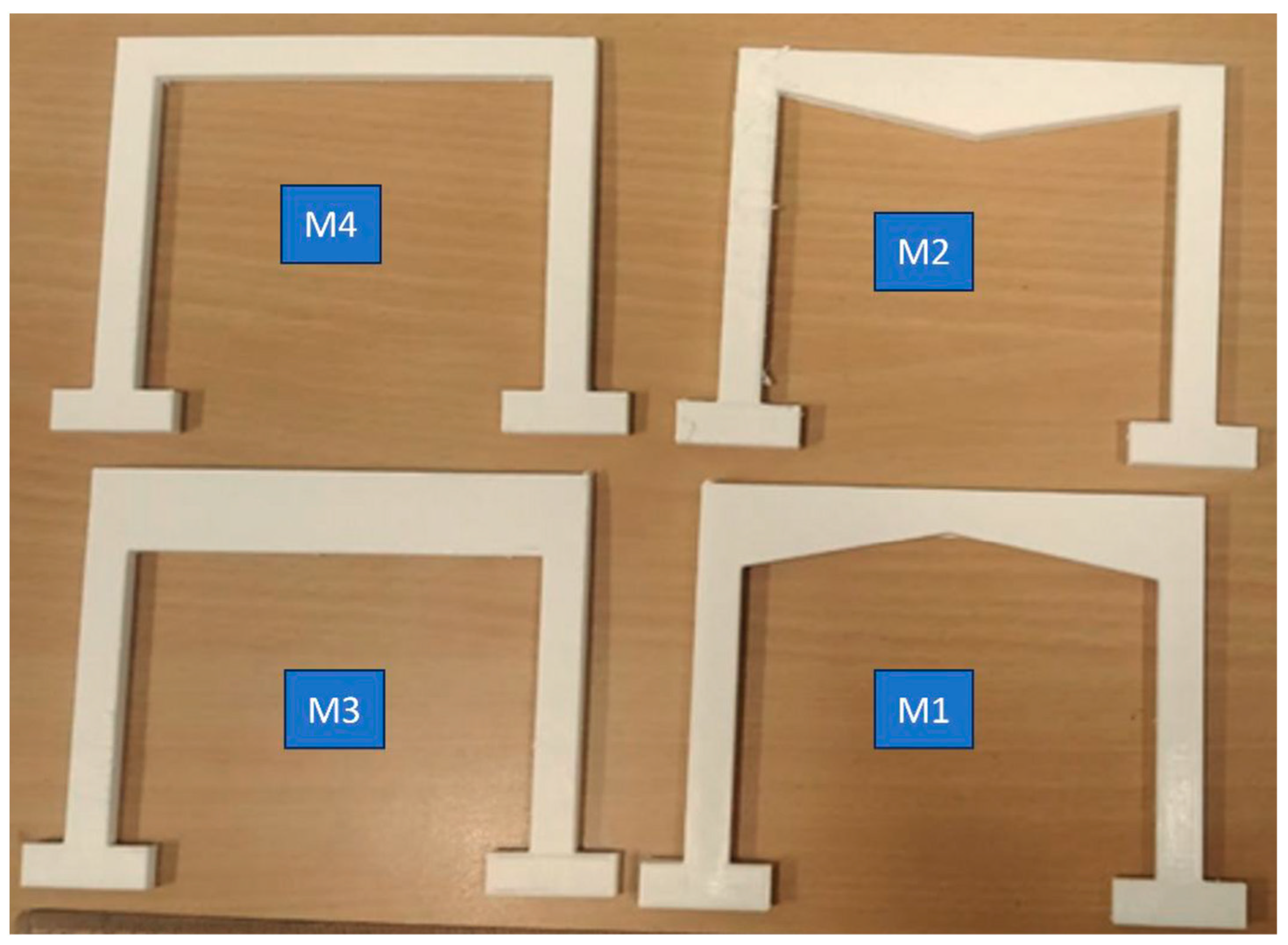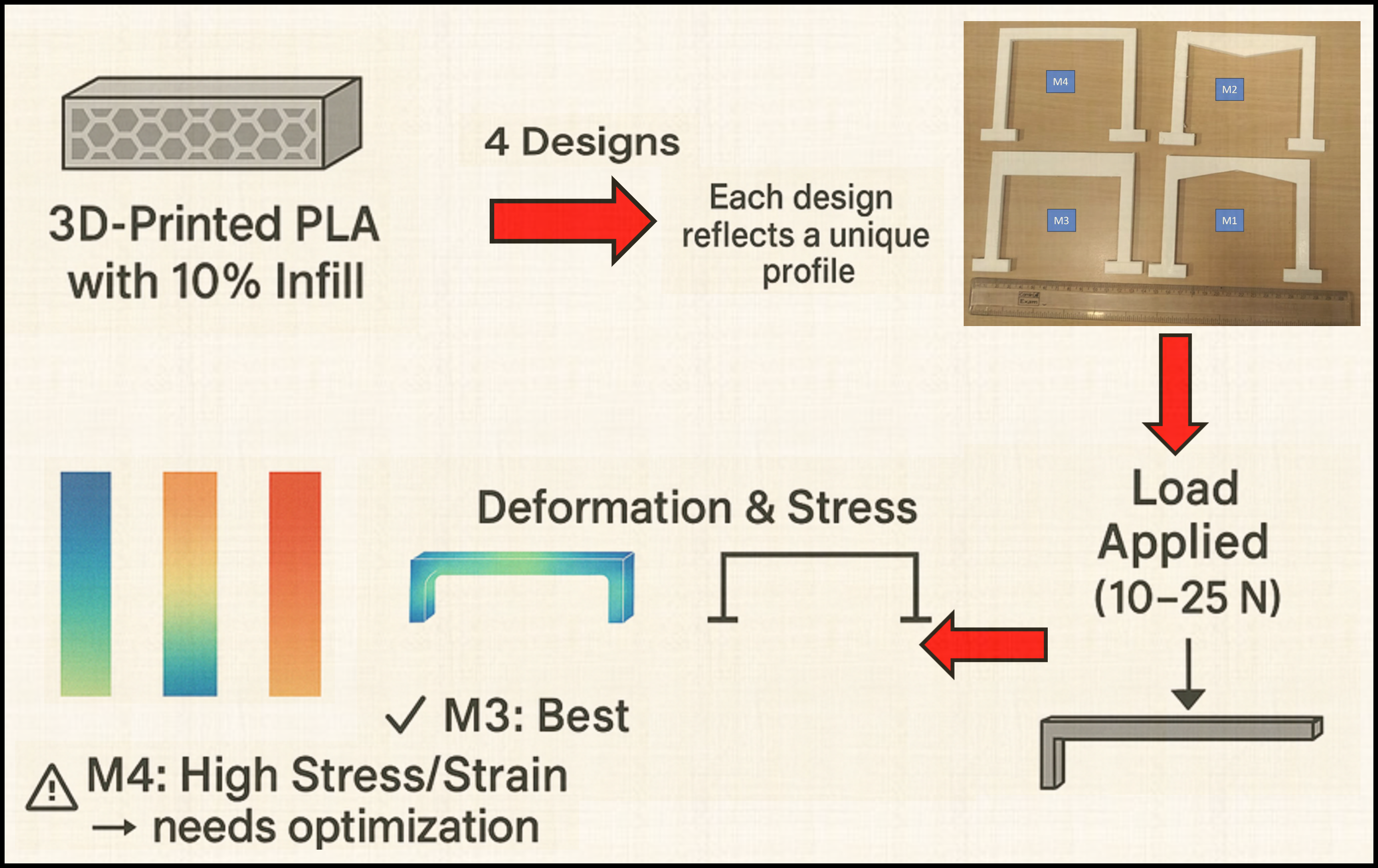 Figure 1, each design reflects a unique profile, M1 features a shallow arch, M2 a tapered inverted V, M3 a uniform rectangular profile, and M4 a wide flanged (I section like) configuration. These variations were intentionally designed to study how changes in geometry affect structural behaviour, and to identify the optimised load bearing design through finite element analysis. The designs were fabricated using a MakerBot 3D printer with settings including a layer height of 0.2 mm, nozzle diameter of 0.4 mm, printing speed of 60 mm/s, infill density of 10%, printing temperature of 210 °C, and bed temperature of 60 °C. The printed specimens are presented in