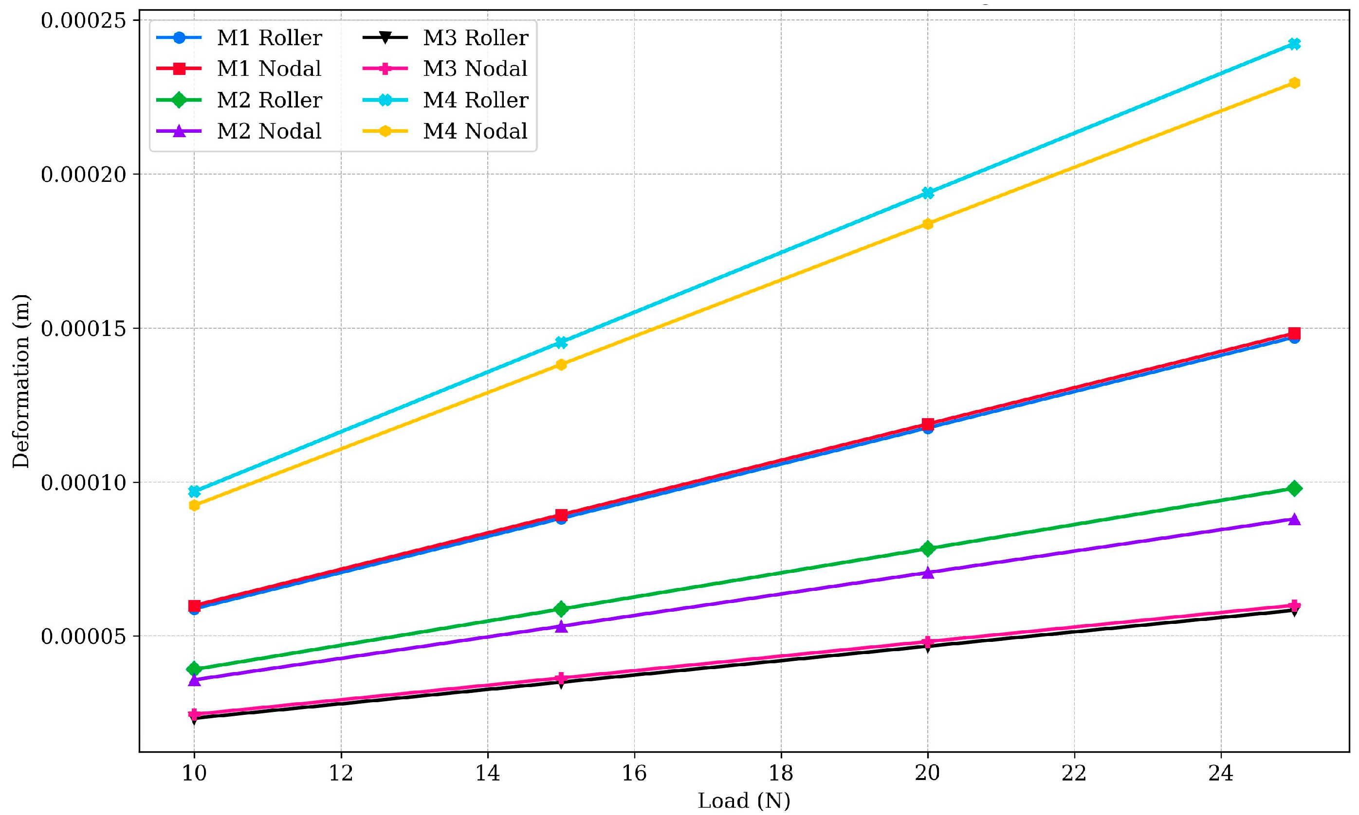 Design M3 was the most stable among all the tested designs, exhibiting the lowest deformation values. The roller configuration ranged from 2.3342 × 10−5 m at 10 N to 5.8355 × 10−5 m at 25 N, while the nodal configuration ranged from 2.3601 × 10−5 m to 5.9003 × 10−5 m. The percentage variation between configurations was minimal (less than 2%), indicating consistent deformation resistance in both designs. This improved performance is attributed to M3’s optimised geometry, which enhances its ability to resist deformation under varying loads and contributes to its structural stability. In contrast, Design M4 exhibited the highest deformation values among all the configurations. The roller configuration ranged from 9.6922 × 10−5 m at 10 N to 2.423 × 10−4 m at 25 N, while the nodal configuration ranged from 9.1426 × 10−5 m to 2.2857 × 10−4 m. The roller configuration exhibited approximately 5–8% higher deformation than the nodal configuration, indicating less effective load distribution. These results suggest that Design M4 may be less suitable for applications requiring high structural integrity, as its design leads to greater displacement under load.