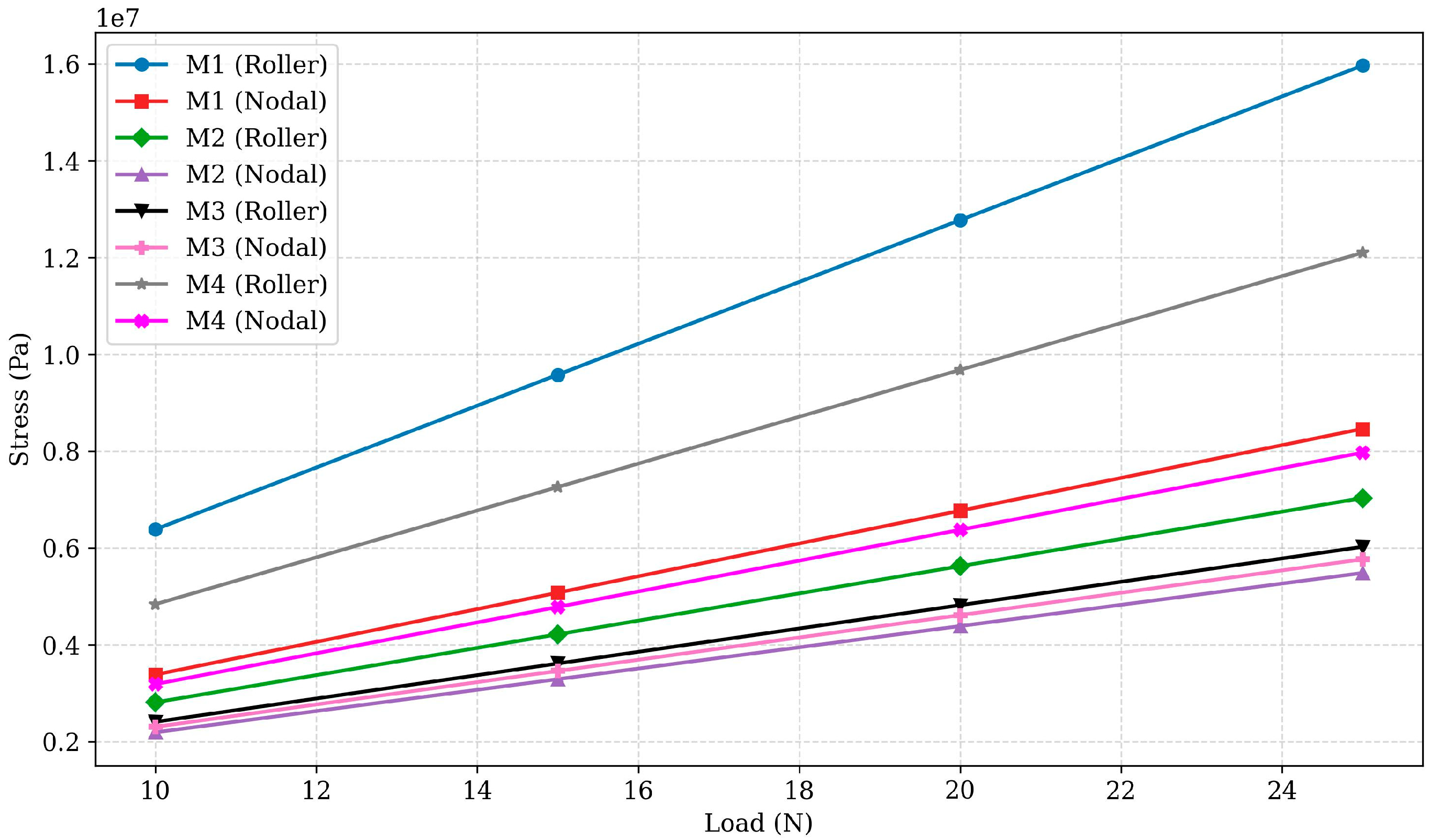 For Design M1, the roller configuration exhibited stress values ranging from 6.3854 × 106 Pa at 10 N to 1.5963 × 107 Pa at 25 N, while the nodal configuration ranged from 3.385 × 106 Pa to 8.4624 × 106 Pa. The roller configuration showed approximately 90% higher stress, highlighting the nodal design’s more effective stress management. However, the significant stress variation suggests that M1 may not be suitable for applications requiring uniform stress distribution across configurations. For Design M2, the roller configuration stress values ranged from 2.8125 × 106 Pa to 7.0312 × 106 Pa, while the nodal configuration ranged from 2.194 × 106 Pa to 5.485 × 106 Pa. The roller configuration exhibited approximately 28% higher stress, showing that the nodal configuration handles stress more effectively. This makes M2 a balanced design for moderate-load applications, though the roller configuration could benefit from better load distribution.