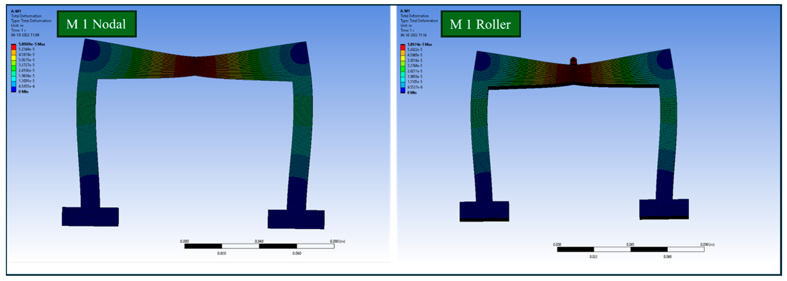 −4 m. The percentage difference between these configurations was minimal (less than 0.5%), indicating nearly identical performance and suggesting that both configurations are equally effective in resisting deformation under load. This suggests that the roller design’s ability to more evenly distribute the load may result in slightly reduced deformation compared to the nodal design, although the difference is negligible. Design M2 displayed intermediate deformation characteristics, with roller configuration values ranging from 3.9172 × 10