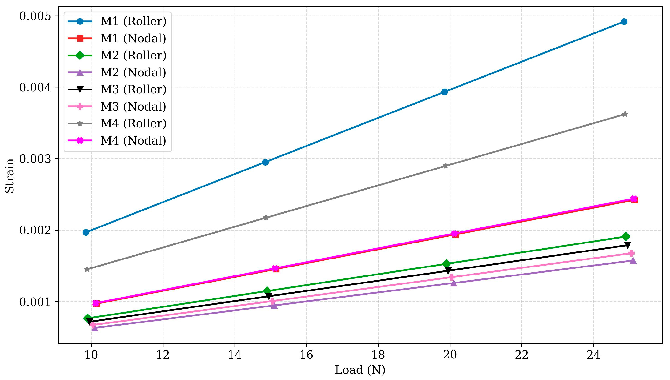 Figure 7. For Design M1, the roller configuration exhibited strain values ranging from 0.0019664 at 10 N to 0.0049161 at 25 N, while the nodal configuration ranged from 0.0009689 to 0.0024223. The roller configuration had approximately 100–103% higher strain than the nodal configuration, indicating a reduced elastic recovery in the roller design. Despite similar deformation values, the roller configuration exhibited significantly higher stress and strain, reflecting less efficient load distribution. In contrast, the nodal configuration managed stress and strain more effectively, highlighting its efficient performance for applications requiring consistent structural integrity. Design M2 exhibited strain values ranging from 0.00076298 to 0.0019075 in the roller configuration and from 0.00062873 to 0.0015718 in the nodal configuration. The roller configuration showed approximately 20–22% higher strain, reflecting reduced elastic recovery compared to the nodal configuration. While the roller configuration exhibited 10–12% lower deformation, its higher strain values highlight its reduced efficiency in handling elastic distortion.