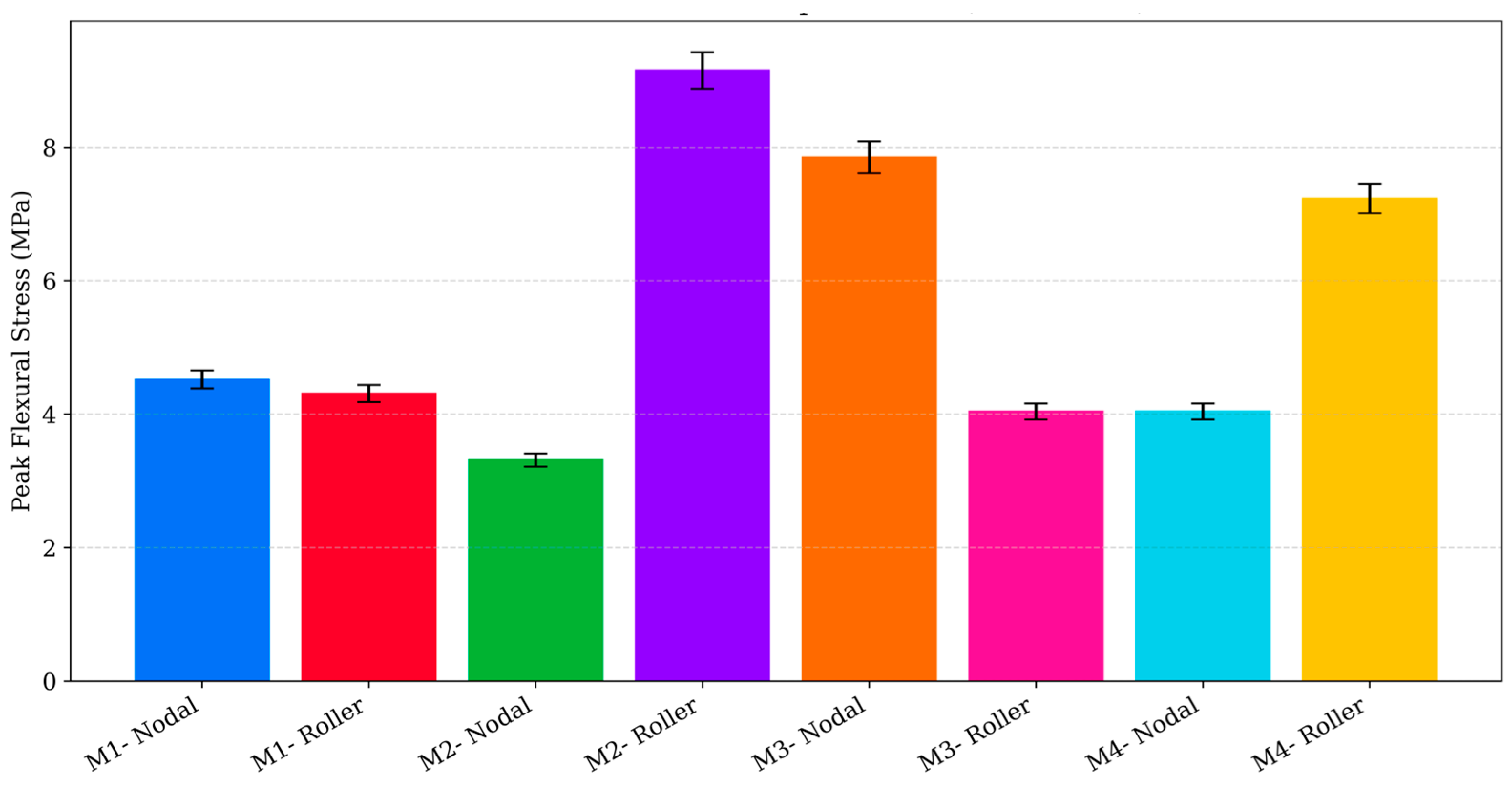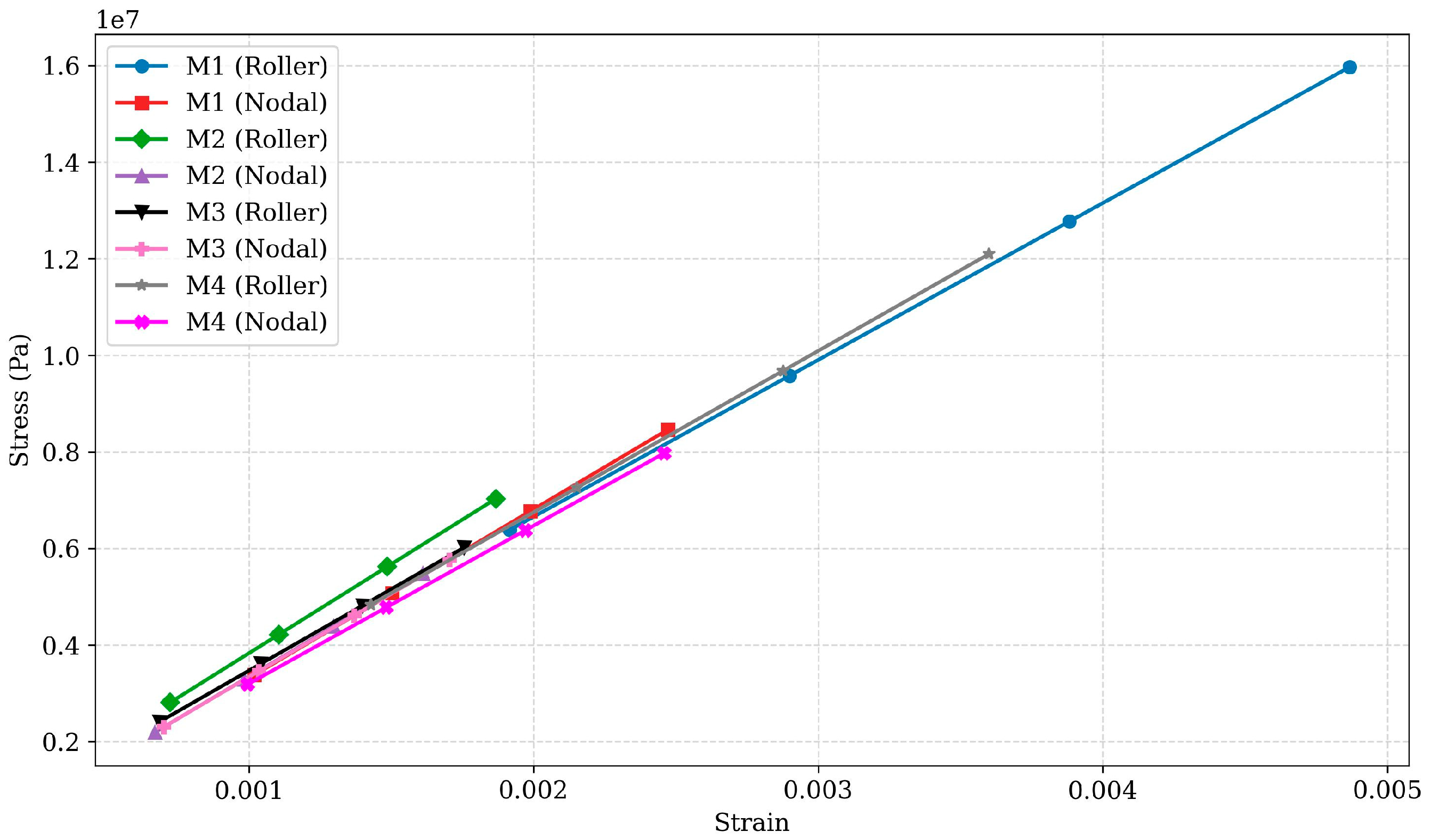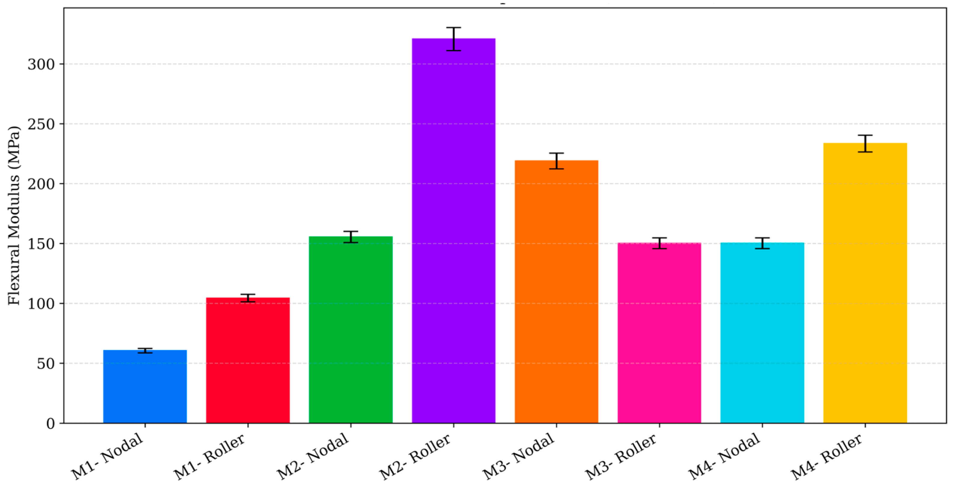 Figure 9. The apparent moduli ranged from 94.6 to 100.2 MPa for M1, 129.8–326.0 MPa for M2, 139.3–212.1 MPa for M3, and 139.3–225.4 MPa for M4. When normalised relative to M3 (Roller) to allow direct comparison of relative stiffness trends, the experimental stiffness ratios were 0.72 (M1-Roller), 2.34 (M2-Roller), 1.52 (M3-Nodal), and 1.62 (M4-Roller). In contrast, the FE-derived relative stiffness ratios were 0.40 (M1-Roller), 0.60 (M2-Roller), 0.99 (M3-Nodal), and 0.24 (M4-Roller). The deviation between numerical and experimental stiffness ratios therefore ranged from approximately 28% to 85%, with M2 (Roller) and M4 (Roller) exhibiting the largest overestimation of stiffness in the experimental measurements.