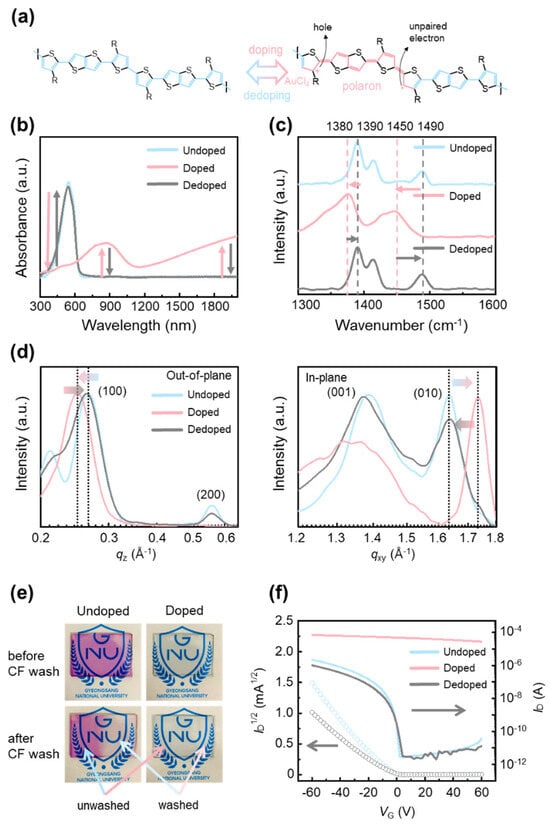 (a) Schematic illustration of the transition in conjugated structure of PBTTT under doping and dedoping. (b) UV-vis-NIR absorption spectra, (c) Raman spectra, and (d) one-dimensional profiles in 2D-GIXD patterns of PBTTT in undoped (blue), doped (red), and dedoped (grey) states. (e) The undoped and doped PBTTT thin films on glass wafer before and after chloroform (CF) washing. (f) Transfer characteristics of OFETs based on undoped (blue), doped (red), and dedoped (grey) PBTTT films.