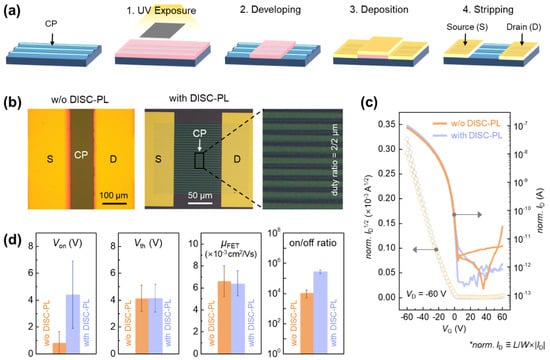 (a) Schematic illustration of the two sequential photolithography-based processes for patterning the PBTTT CP and Au electrodes in the OFET fabrication. (b) Optical microscopy images of PBTTT OFETs without and with CP and electrode patterning using DISC-based photolithography (DISC-PL) shown in left and right panel, respectively (linewidth: 2 μm). (c) Transfer characteristics and (d) OFET parameters including on-set voltage (Von), threshold voltage (Vth), field-effect mobility (μFET), and on/off ratio of PBTTT OFETs without and with DISC-PL process (L: channel length, W: effective channel width). * The normalized source-to-drain current (ID), shown as norm. ID in the panel c, is defined as L/W∙|ID|.