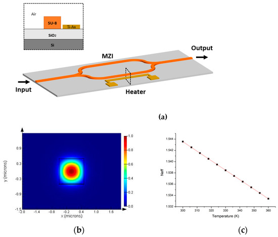 In this work, we design a on-chip FTS with a thermo-MZI, which is illustrated in Figure 1a. showed in black dashed line inset is the cross-sectional view of the heating region of MZI arm, SU-8 and SiO2 are adopted as the core waveguide and under cladding layer materials, respectively. The size of MZI arm waveguide in transactional dimension is 1.2 μm by 1.2 μm. Air covers the SU-8 waveguide as the upper cladding. A Y- branch splitter and combiner are utilized to split and combine light at the MZI’s in/output. A Ti-Au heater is positioned beside the MZI arm. The MZI is tuned by changing the optical path difference through the thermo-optic effect. Then, the retrieved spectrum of the light source can be constructed from the interference signal by the Fourier transform algorithm. The TOC of the SU-8 waveguide in our design is −1.627 × 10−4 K−1. Figure 1b shows the light field distribution of the fundamental transverse electric (TE) mode in the SU-8 waveguide, simulated by Lumerical Mode Solutions. Furthermore, we simulate the refractive effective index () of the fundamental TE mode under different temperature, as shown in Figure 1c. When the temperature excursion is 30 K, the theoretical resolution of a 3 cm arm length MZI is 68 cm−1, corresponding to a wavelength resolution of 16.4 nm and 4.9 nm at λ = 1550 nm and 850 nm, respectively.
