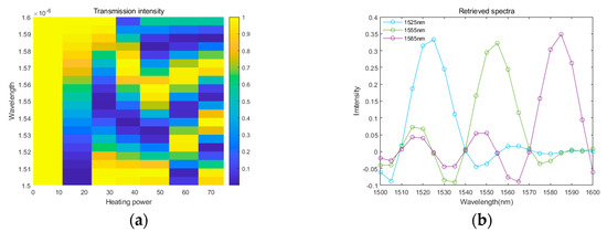is wavenumber, is the MZI arm length, is the refractive index difference between arm waveguides tuned by the TO effect. We simulate the transmittance spectra of the MZI at wavelength from 1500 nm to 1600 nm, as shown in Figure 2a. The optical path difference in MZI changes with the temperature over scanning time to obtain the interference signal of the light source. Based on the simulated transmittance spectra, we retrieve the spectrum of the monochromatic light (1525 nm, 1555 nm and 1565 nm), by the calibration matrix method [11]. The retrieved spectra of the monochromatic input are presented in Figure 2b, which shows the full width at half maximum (FWHM) less than 20 nm.