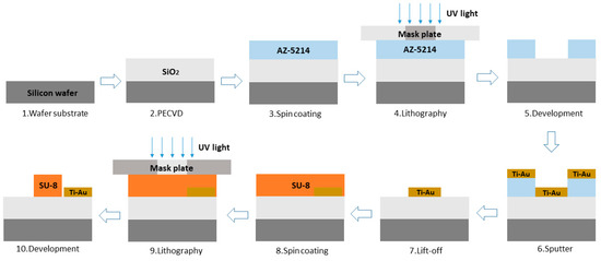 Our device is fabricated on a Si wafer. The schematic of the FTS chip manufacturing process is shown in Figure 3. Firstly, 10 μm thick SiO2 is deposited on Si substrate by plasma enhanced chemical vapor deposition (PECVD) method, as the under cladding and thermal insulation layer. Secondly, 20 nm thick titanium and 80 nm thick gold are deposited in magnetron sputter, followed by lift-off process to form the heating electrode. SU-8-1040 is then spun onto the wafer surface at a speed of 3000 rpm to form a 1.2 μm thick waveguide core after lithography exposure and development. Figure 4 are the optical micrographs of the fabricated MZI arm and Y-splitter. Figure 4a shows the detailed structures of spiral waveguide and heating electrodes. 3.26 cm long arm spirals tightly in seven loops within 2000 × 1000 μm2 region, with minimum bend radius of 400 μm and an adjacent gap of 18um. A 10 μm wide metal heater curls alongside the arm with a gap of 4 μm, providing heat to SU-8 waveguides of both the inner and outer loop. The footprint of the fabricated FTS chip is 2 mm × 12 mm.