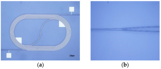 Micrographs of (a) the MZI arm with metal electrodes; (b) Y splitter.