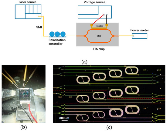 The measurement setup is illustrated in Figure 5a. A tunable laser (81606A, Keysight Technologies, Santa Rosa, CA, USA) emits light from 1500 nm to 1600 nm at a step of 5 nm. After transmitting through a three-paddle polarization controller, the TE-polarized light enters into the FTS chip via a polarization-maintaining lensed fiber. At the output end of the chip, light is collected by a single-mode fiber (SMF) and then propagates into a power meter (GM83011, UC Instruments Corp., Fremont, CA, USA). The FTS chip is stuck on a thermoelectric cooler (TEC) to stabilize temperature, with two 3-axis stages on both side to adjust the position of fiber. The heating electrodes on the chip are connected to a voltage source (Keithley2400, Tektronix, Beaverton, OR, USA) by a pair of direct current (DC) probes for power scanning, as shown in Figure 5b. Figure 5c is the micrograph of part of the fabricated FTS chip, which contains six individual FTSs with different arm lengths in a compact arrangement.