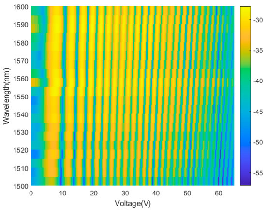 To calibrate the device, we experimentally measure the transmittance spectra of the MZI by voltage scanning at each wavelength from 1500 nm to 1600 nm, as shown in Figure 6. With power injection, the interference signal of monochromatic input shows sinusoidal oscillation, but decay in intensity. At high power level, the heating efficiency decreases due to heat dispassion and heat crosstalk. Phase and amplitude deviations from the theoretical sinusoidal curve of MZI are caused by fabrication imperfections, propagation losses, uneven power-splitting and wavelength dependence of edge coupler. The resistance of Ti-Au heater is measured to be ~1.6kΩ at room temperature. The optical path length difference of MZI is tuned by micro heater with the maximum power consumption of 2.2 W to obtain the interference signal of the light source. The total effective length of waveguide is approximately 3.26 cm.