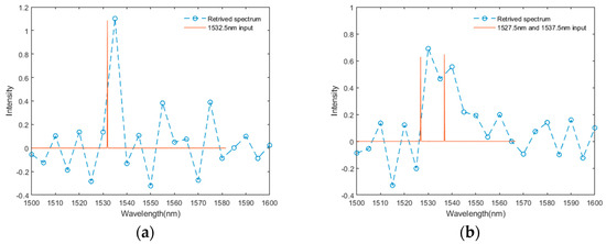 The spectral resolving ability of the fabricated FTS chip is characterized by a tunable laser source (TLS). Based on the above experimental transmittance spectra, we retrieve the spectrum of the monochromatic light emitted by a laser source. The final retrieved spectra of the monochromatic input (1532.5 nm) and doublet light (1527.5 nm and 1537.5 nm) are presented in Figure 7. The resolution of our achieved FTS can be obtained from the peak broadening effect of the monochromatic laser-measured result in Figure 7a, with a FWHM less than 10 nm. Figure 7b shows the resolving ability of our achieved FTS from the peak aliasing of doublet light measured result. Peak wavelengths separated by more than 10 nm can be identified by our device. The deviation from the measured wavelength is caused by coarse wavelength sampling in calibration, which can be improved by more precise wavelength scanning.