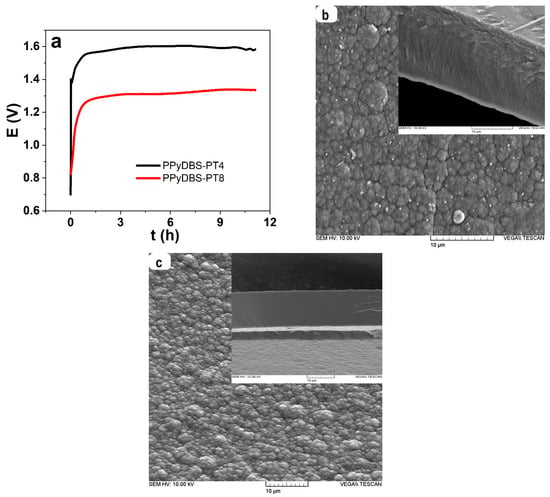 PTA are well-known polyanions that are generally applied to form a suspension of carbon particles, such as carbon-derived carbon or multiwall carbon nanotubes in an aqueous solution [32]. Using only pyrrole and PTA as electrolytes, the electropolymerization did not lead to any stable PPy-PT films, while the addition of NaDBS formed stable PPyDBS-PT films. The electropolymerization curves of PPyDBS-PT4 and PPyDBS-PT8 are presented in Figure 1a. The SEM surface with the inset of the cross-section image is shown for PPyDBS-PT4 in Figure 1b and those from PPyDBS-PT8 in Figure 1c.