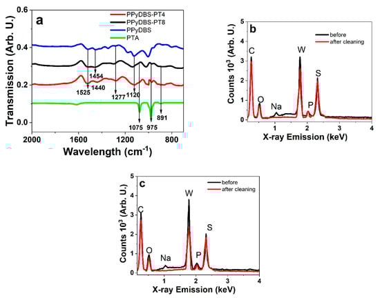 (a) FTIR measurements (2000 cm−1–700 cm−1) of PPyDBS-PT8 (black line), PPyDBS-PT4 (red line), PPyDBS (blue line), and PTA (green line). EDX spectroscopy at oxidized state (0.65 V) before (black line) and after cleaning (red line) of PPyDBS-PT4 shown in (b) and PPyDBS-PT8 in (c).