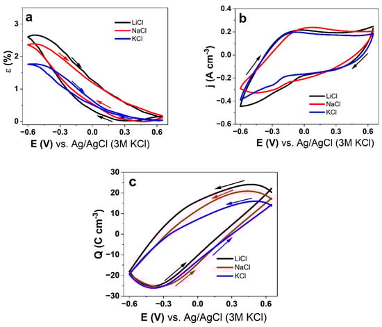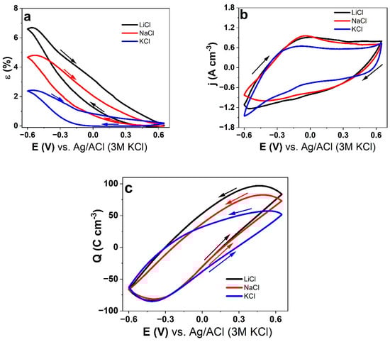 The PPyDBS-PT8 films underwent the same cyclic voltammetric measurements applying the same aqueous electrolytes (LiCl, NaCl, and KCl) with the strain shown in Figure 4a, current density curves in Figure 4b, and charge density in Figure 4c against the potential E (0.65 V to −0.6 V).
