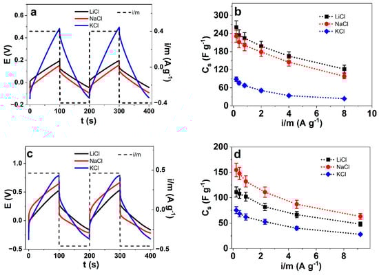 Chronopotentiometric measurements in aqueous electrolytes LiCl (black line, ■), NaCl (red line, ●), and KCl (blue line, ◆) presenting PPyDBS-PT4 within (a) potential E (against Ag/AgCl (3M KCl)) time t curves (3rd and 4th cycles) at ±4.0 A g−1 (dashed black line) and in (b) the specific capacitance Cs calculated from Equation (1) against current densities i/m (±0.2 A g−1–±8.0 A g−1). The PPyDBS-PT8 films of the potential time curves are presented in (c) and the specific capacitance against the current densities i/m (±0.23 A g−1–±9.2 A g−1) are displayed in (d).