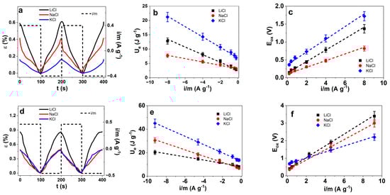 Chronopotentiometric measurements of the PPyDBS-PT composites using three different aqueous electrolytes such as LiCl (black line, ■), NaCl (red line, ●), and KCl (blue line, ◆). The strain time curves (two subsequent cycles, 3rd–4th) at the current density i/m of ±0.4 A g−1 (black dashed line) of PPyDBS-PT4 are presented in (a). From Equation (2), the electrical energy (Ue) at discharging against current densities i/m is shown in (b) and the maximum potential at oxidation (Eox) against current densities is displayed in (c). The PPyDBS-PT8 potential time curves (3rd–4th cycles) at ±0.46 A g−1 (dashed black line) are shown in (d). The electrical energy Ue is presented in (e) and the potential at oxidation Eox in (f) against the current densities i/m. The dashed lines in (b–e) represent the linear fits with the R2 correlation coefficient between 0.98 and 0.99.
