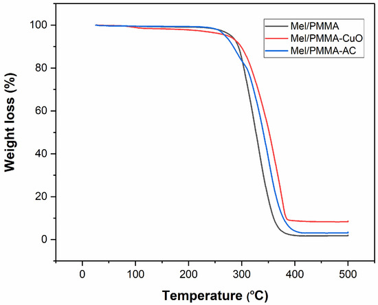 TGA micrograph of cross-linked PMMA/Mel, PMMA/Mel-CuO, and PMMA/Mel-AC.