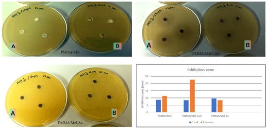 In the present study, through a suitable diffusion method, PMMA polymers and their activity were tested as antibacterial agents against S. aureus as a Gram-positive bacterium and E.coli as a Gram-negative bacterium. In Figure 5, it can be seen that PMMA/Mel showed antimicrobial efficient activity against the two different bacterial strains, which was promoted by increasing the integration with NPs. The PMMA/Mel polymer, with the incorporation of CuO and activated carbon NPs, had greater activity against the bacteria than PMMA/Mel without the integration with NPs, as shown in Figure 5. This enhancement in the antibacterial activity arises from the very small size of CuO NPs, which can enter the cell wall of the bacterium and then kill it via denaturation of the cell permeability, or from the contact of CuO with many enzymes.
