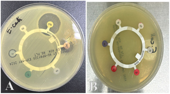 E. coli pathogenic bacteria was tested against twelve antibiotics to determine their susceptibility. The bacteria were cultured overnight in nutritional broth for activation, determined by measuring the optical density (OD) at 600 nm with a UV-visible spectrophotometer, and, subsequently, standardized to 0.1 McFarland standards (3107 CFU/mL). Later, the bacterial suspension was dispersed on MHA. The agar was then covered with antibiotic discs and incubated at 37 °C for 24 h. Later, the sizes of the zones of inhibition were measured and reported [].