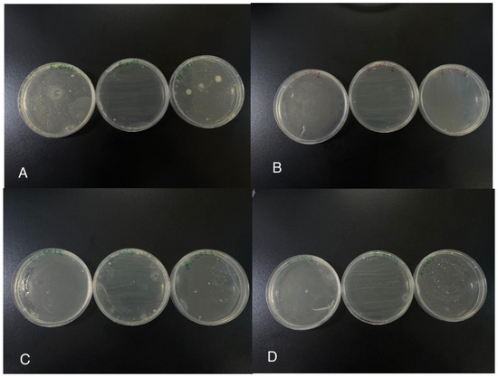 where B and A are the mean numbers of bacteria in the control samples (CFU/sample) and treated samples after 24 h of incubation (CFU/sample), respectively. The above technique was performed in triplicate for the suggested replications [].