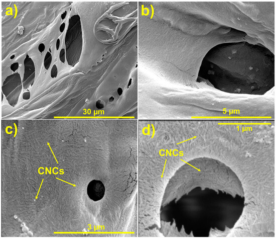 The morphology of the unmodified and CNC–luffa surfaces was examined using a Scanning Electron Microscope (SEM) (FEI Inspect-F, Eindhoven, The Netherlands) to examine the impact of the CNC coating on the surfaces and structures of the luffa samples.