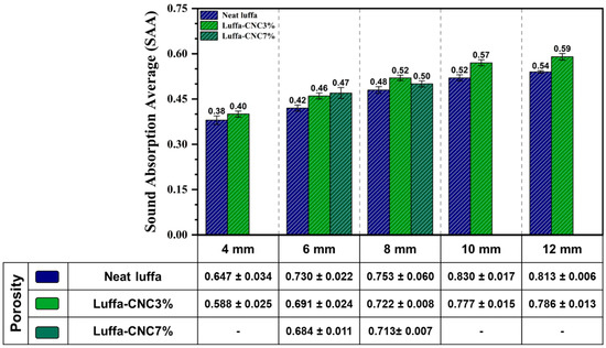 Sound Absorption Average (SAA) comparison for two layers of neat luffa and CNC3% and CNC7% luffa composites with different panel thicknesses, considering panel porosity.