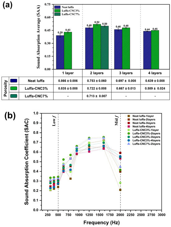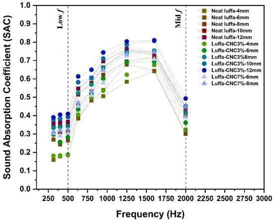 The Sound Absorption Coefficient (SAC) and Sound Absorption Average (SAA) were systematically analysed for unmodified and CNC-modified luffa samples, considering various thicknesses, layer configurations, and CNC concentrations. Low-frequency noise, typically in the range of 20–500 Hz, can cause significant physiological and psychological effects [45,46], while mid-frequency noise (500–2000 Hz) often dominates environmental soundscapes such as traffic or machinery noise [47,48]. Thus, materials capable of reducing noise across these frequencies are critical. This study evaluates the acoustic performance of luffa-based binderless panels with CNC modifications, aiming to optimise their performance through hierarchical structures.