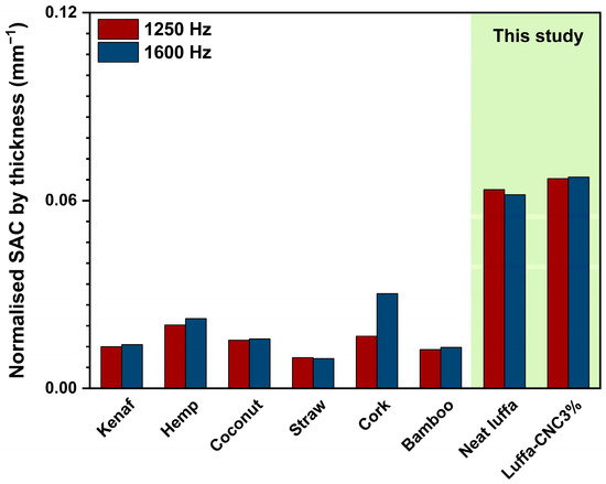 Figure 5 presents a comparative summary of normalised SAC for both the literature-reported values [53,54] and CNC3% luffa composites, demonstrating the effectiveness of CNC inclusion in enhancing sound absorption. The hierarchical structure and tortuosity introduced by CNC particles not only increased energy dissipation, but also allowed for the material to maintain competitive performance while retaining sustainability and lightweight characteristics.