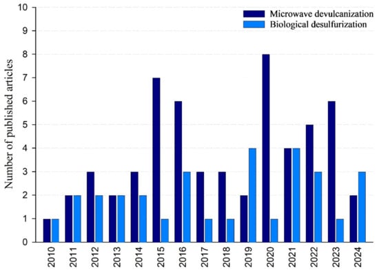 Research on microwave devulcanization has gradually increased, with the earliest studies published in 1978. The highest number of published papers reached eight in 2020, and the output has remained fairly high since then, with six papers released in 2023. From 2010 to 2024, this area’s cumulative number of publications amounts to 57 papers. The data indicate a consistent growth in interest, especially in recent years, highlighting an increasing acknowledgment of this devulcanization technique. In comparison, biological desulfurization has experienced more erratic development. The peak number of publications was in 2019 and 2021, with four papers released each year. Overall, 31 papers have been published on this topic from 2010 to 2024. This indicates a more specialized, yet still significant, area of research. Figure 1 illustrates the number of papers issued on biological desulfurization and microwave devulcanization between 2010 and 2024.