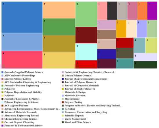 The Journal of Applied Polymer Science is the leading publication in microwave devulcanization, having released seven papers on the subject. Other important journals comprise the Express Polymer Letters and AIP Conference Proceedings, each contributing four papers. Journals such as Polymers and Polímeros have each published three papers showing the importance of polymer science. The most prominent journal for biological desulfurization is Polymer Degradation and Stability, which has published seven related papers. The other significant journal is the Journal of Polymers and the Environment, which released three papers revealing this field’s environmental emphasis. Journals like Applied Microbiology and Biotechnology, as well as Biotechnology Advances, also hold prominence, reinforcing the biological element of the desulfurization method. Figure 2 and Figure 3 illustrate the various journals that publish research on biological desulfurization and microwave devulcanization.
