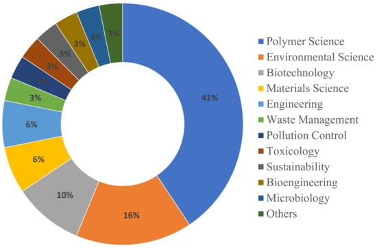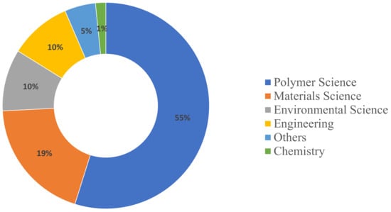 In microwave devulcanization, polymer science is the primary subject area, with 34 papers highlighting its critical role in innovating materials and improving recycling technologies. Materials Science is also significant, contributing twelve papers, while Engineering and Environmental Science each add six to the discourse. In biological desulfurization, polymer science leads with a total of 13 papers. Trailing behind is Environmental Science, which has five papers underscoring the method’s focus on ecological advantages and sustainability. The dispersal of subject areas for biological desulfurization and microwave devulcanization is depicted in Figure 4 and Figure 5.