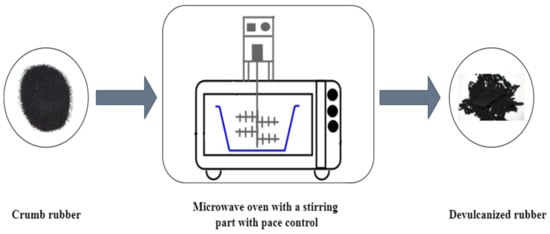 Figure 6 schematically depicts the rubber microwave devulcanization system. This figure shows that a commonly used microwave oven equipped with a stirring part with a pace control was used to devulcanize rubber []. This motorized polytetrafluoroethylene (PTFE) stirrer was placed in the microwave to expose ground tire rubber (GTR) to the microwaves homogeneously [,]. Over the process of devulcanization, a 15–80 g sample of each type of GTR was put in the PTFE (300 mL) or a glass beaker (600 mL) [,]. Finally, the sample was exposed to microwave radiation at different exposure times.