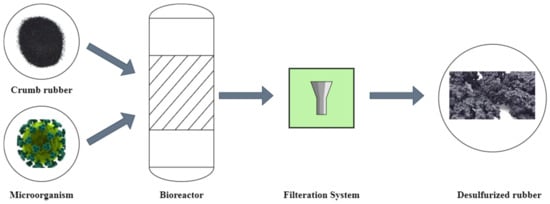 - Li, Y.; Zhao, S.; Wang, Y. Microbial Desulfurization of Ground Tire Rubber by Thiobacillus Ferrooxidans. Polym. Degrad. Stab. 2011, 96, 1662–1668. [Google Scholar] [CrossRef]